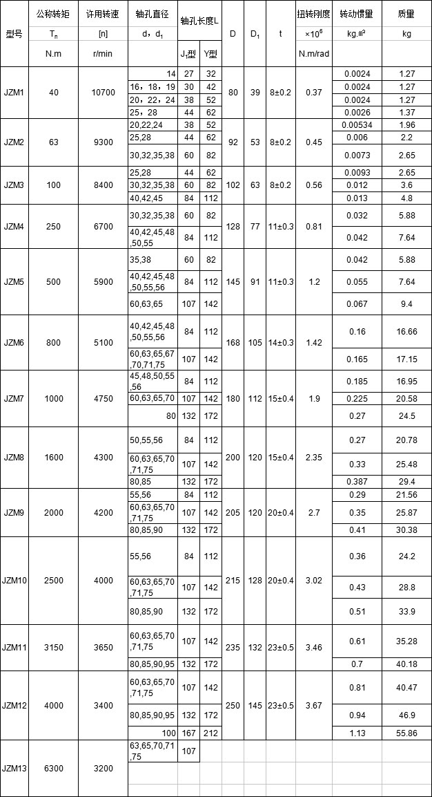 JZM膜片联轴器 特点及应用场合:与金属弹性元件挠性联轴器相比,具有机械强度高,承载能力大、质量轻结构尺寸小、传动效率和传动精度高,装拆方便等特点。适用于中、高-速、大转矩轴系传动。与鼓形齿式联轴器相比,具有无相对滑动,不需润滑,使用寿命长、无噪声、结构简单等特点.可部分代替鼓形齿式联辅器。不受温度和油污影响。具有耐酸、碱,防腐蚀的特点。可用于高温、低温和有油、有水和腐蚀介质的工况环境.适用于各种机械装置载荷变化不大的轴系传动,通用性强,工业发达国已普遍采用,是我国重点推广应用的高-性能挠性联轴嚣,高-精度膜片联轴器可用于高-速工况。膜片联轴器与齿式联轴器相比,没有相对滑动,不需要润滑、密封,无噪声,基本不用维修,制造较方便,可部分代替齿式联轴器。膜片联轴器在国际上工业发达国应用已很普遍,在实际应用中一般采用接中间轴型,以提-高两轴线偏移补偿性能。