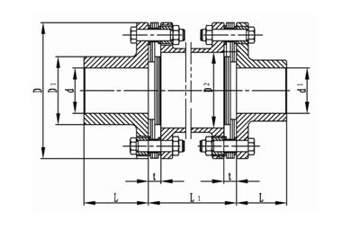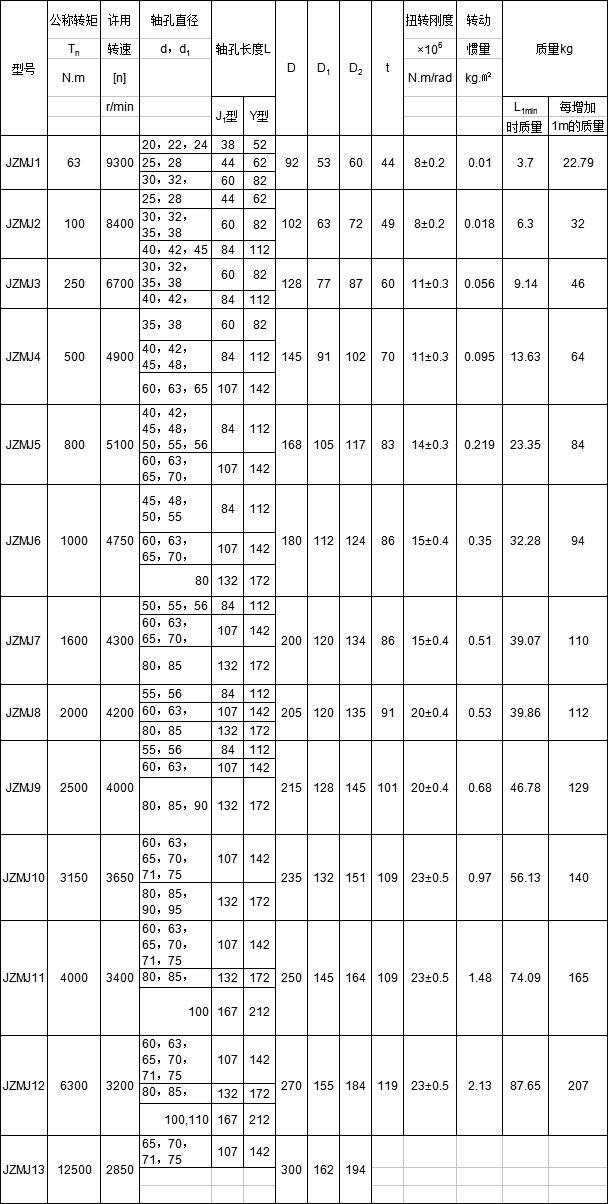JZMJ膜片联轴器 特点及应用场合:与金属弹性元件挠性联轴器相比,具有机械强度高,承载能力大、质量轻结构尺寸小、传动效率和传动精度高,可靠性好、装拆方便等特点。适用于中、高速、大转矩轴系传动。与鼓形齿式联轴器相比,具有无相对滑动,不需润滑,使用寿命长、无噪声、结构简单等特点.可部分代替鼓形齿式联辅器。不受温度和油污影响。具有耐酸、碱,防腐蚀的特点。可用于高温、低温和有油、有水和腐蚀介质的工况环境.适用于各种机械装置载荷变化不大的轴系传动,通用性极强,工业发达国家已普遍采用,是我国重点推广应用的高性能挠性联轴嚣,高精度膜片联轴器可用于高速工况。膜片联轴器与齿式联轴器相比,没有相对滑动,不需要润滑、密封,无噪声,基本不用维修,制造较方便,可部分代替齿式联轴器。膜片联轴器在国际上工业发达国家应用已很普遍,在实际应用中一般采用接中间轴型,以提高两轴线偏移补偿性能。